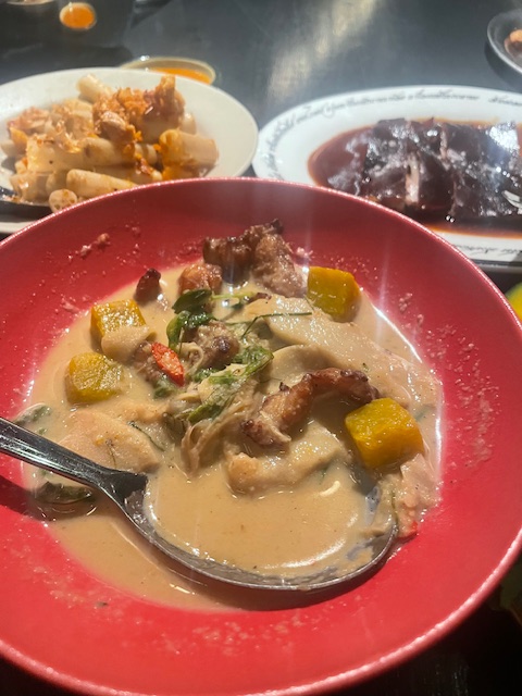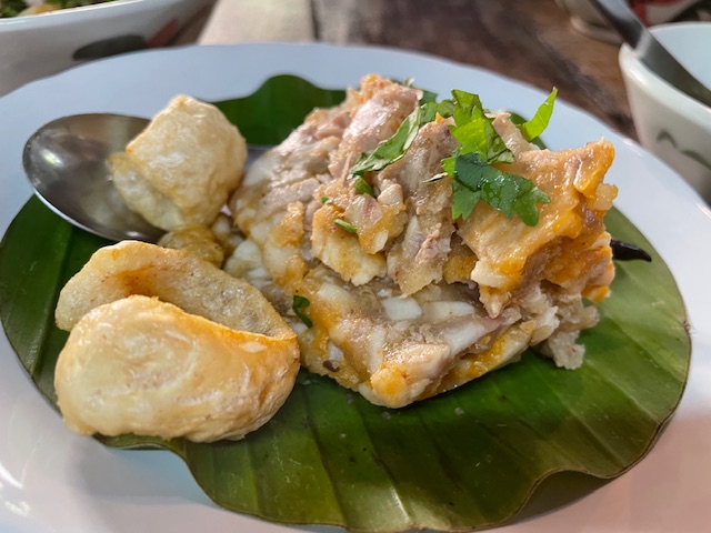 When it comes to Thai food, I come face-to-face with things I haven’t seen before all the time. That’s one of the things I love about Thai food. I was recently served “gang lork” at Khao San Sek by Chef Worakan “Grace” Krittisirikul, who hails from Phetchaburi (recently designated a UNESCO City of Gastronomy). In a nod to her roots, “gang lork” appeared as part of the samrub (Thai meal) and I was enchanted, both by the taste and by the name. No less an authority than Hua Hin Today (I am not being facetious, HHT is a treasure trove of information, seriously) says that “gang lork”‘s name came from the fact that its non-spicy nature made Phetchaburians skeptical about its curry bona fides, since, to them, curries must make your head sweat and your ears ring.