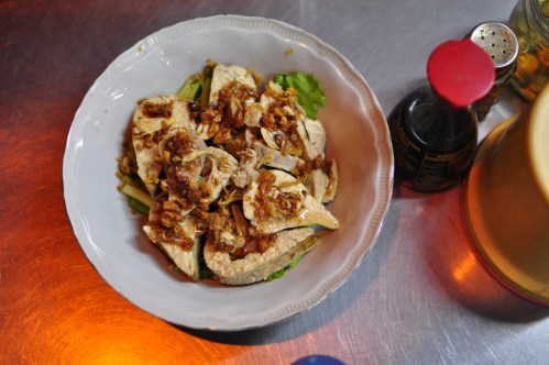 There’s not much more to be said about fish porridge, except that it comes in three varieties: fatty pomfret with the silvery slivers of skin attached (pla jiramit, favored by Thais), plump chunks of seabass (pla kapong, which was just meh), and oyster (hoy nangrom). The charms of such a straightforward dish can be elusive: simply poached fish in a fish stock with boiled rice, accompanied by a brown fermented soybean sauce, it draws the fine line between subtle Chinese-Thai delicacy and hospital food. And for the princely sum of 300 baht, one could find a showier, more flavorful deal somewhere else.