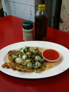 Oyster omelette with sweet chili dipping sauce, fish sauce and white pepper