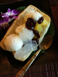 Ice cream ruamitr, a mix of jackfruit and water chestnut flavors against a coconut cream background, is drizzled with carnation milk and served in a hot dog bun. This is the way Thais — rich and poor, young and old, big and small (okay, usually pretty big) — have been enjoying their ice cream for decades. This dessert/snack spans from the humblest streetside mobile vendor’s offerings at 10 baht a bun to a more “hi-so” (and dare I say, overpriced) version with black beans, palm sugar fruit and mango at 10 times that price. A reminder that, as bad as things have gotten, we all have something in common.
