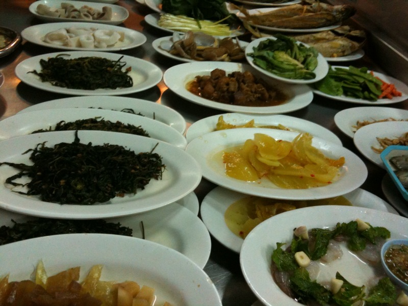 Khao tom is meant to be a sort of restorative concoction, which is why it is known as being particularly popular with the elderly. To facilitate digestion, the liquid in each bowl is meant to be sipped before the soggy rice is eaten with a type of side dish — be it spicy, salty, crispy or fatty, the better to go with the nursing-food blandness of the rice. That is why Thais eat rice porridge with a variety of sides, not just one: usually a crunchy pickled vegetable for its tartness; a fatty tranche of salted, dried fish; a sort of yum, or a spicy, tart salad; and a stir-fried green vegetable (indeed, Khao Tom Bowon claims to have been the first to stir-fry morning glory, or pad pak bung).