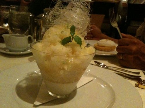 Never had a chance to try the real thing, but this luxury shave ice at Alan Wong’s in Honolulu with agar jelly, pineapple chunks and vanilla panna cotta is da bomb.