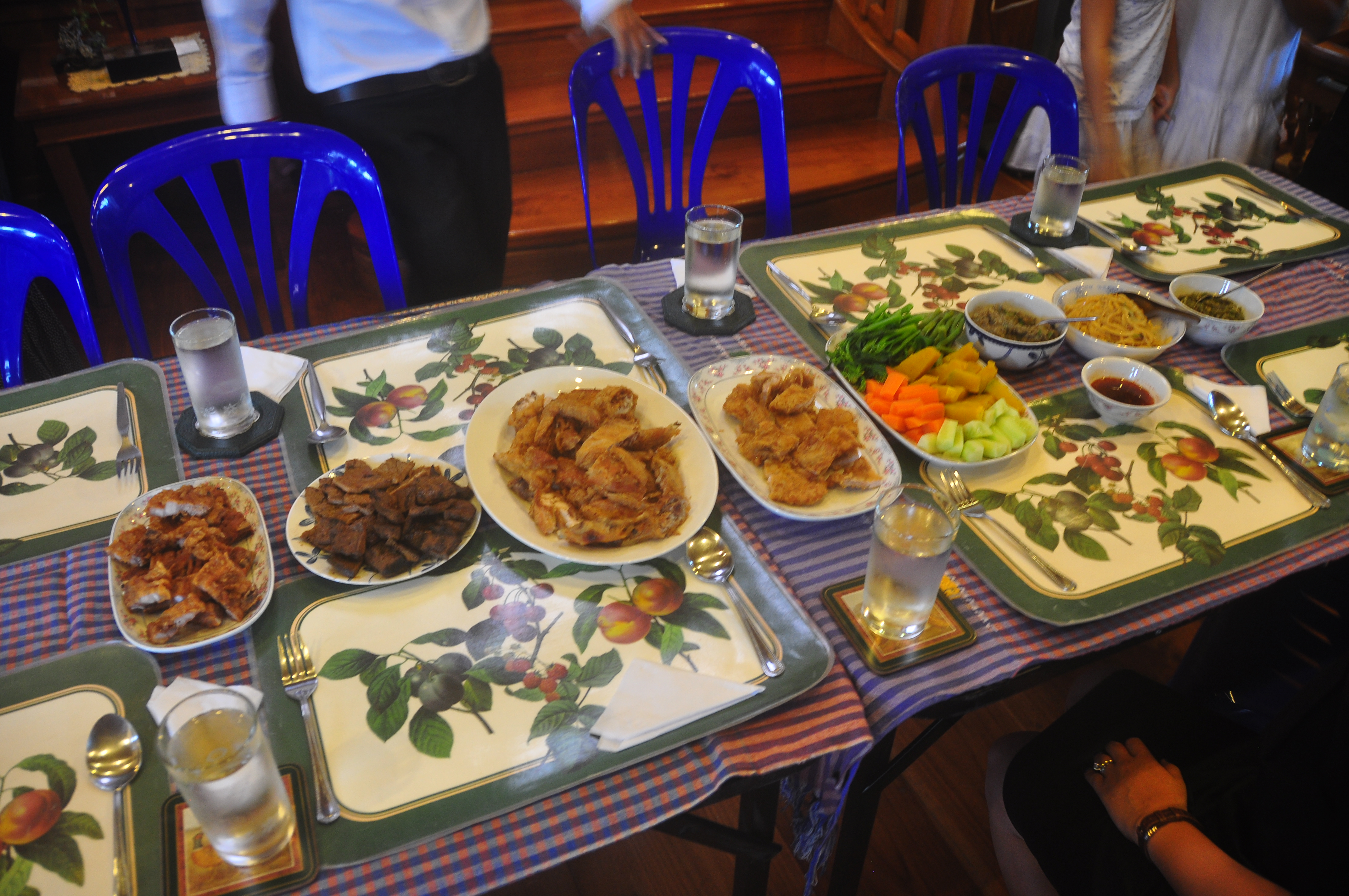 A trip home also isn’t the same without a gigantic breakfast of deep-fried pork, young crushed green chilies (nam prik num) with accompanying boiled veggies, saa pak made of a young fern available only during the rainy season, Northern Thai sausage (the famous sai oua), and macerated roasted eggplant, a Northern Thai version of baba ghanoush (the thum kanoon, or pounded young jackfruit, wasn’t available for some reason. And we had to actually steal the pork larb from the elders’ table). I love these dishes and actively seek them out whenever I am anywhere that claims to serve Northern Thai food.
