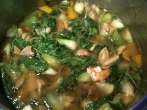 I based this recipe on Chef McDang’s gaeng liang in his “Principles of Thai Cookery”, which calls for pumpkin, buab (sponge gourd), bai tum lung (ivy gourd leaves) and lemon basil leaves. I swapped water out for chicken stock, grilled serpenthead fish in favor of shrimp, and added nam thao, a sort of watery green gourd. Because this soup is so rich in vegetables, you can omit the seafood altogether, but the shrimp paste is essential.