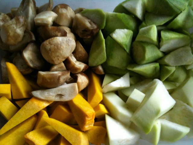 If you can’t find these, substitute zucchini and yellow squash for the gourds, and baby spinach for the ivy gourd leaves.