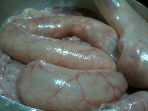 Luckily, it was way easier to stuff the sausages than to make up the stuffing. Jarrett Wrisley, the owner of Soul Food, was kind enough to let my friend Chris and me use his sausage casings (100 percent natural!) and his kitchen, as well as his sai oua expertise — we used a mixture of fish sauce, salt and soy sauce, just like Jarrett does for his own, MSG-free sai oua. Chris made a gorgeous Polish sausage, slightly tart and salty, and a nice chicken sausage studded with dried apple.