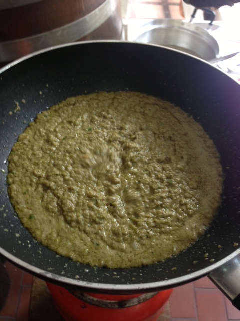 7. Take finished paste and heat in pan with a couple of ladlefuls of coconut milk that have been used to stew the beef.