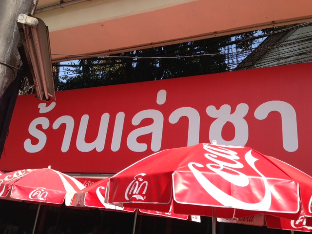 Lao Sa is on the corner of Sunthon Kosa Road, at the Na Ranong intersection, next to the Klong Toey market and the big Rama IV-New Rachadapisek intersection. The sign is a big red and white one that looks like this: