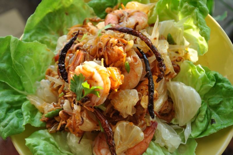 First up: Chin’s favorite restaurant, Krua Sam Hom at Praeng Puthon Square. This road may sound familiar to you because of the perennial tourist favorite, Chote Chitr, which is close to the entrance from Tanao Road. Krua Sam Hom is a little further in, on the right hand side, directly across from the “park” that forms the square.  It is, like most of the places in that neighborhood, surprisingly empty. But that ends up being a blessing, since Chin commandeers the kitchen (she takes a lot of people here), gathering ingredients for a spicy pomelo salad, the recipe for which she has loaned below. She is a whirlwind of instructions and information: the best pomelos come from Samut Songkhram and Nakhon Pathom; good nam prik pao (roasted chili paste) can be bought at Aor Thor Kor; she adds fresh orange segments from a particularly tart type found only in Samut Songkhram. And other stuff: how many modern Thai stir-fry cooks rely on margarine to add color and sheen to their creations, at the expense of aroma; to always have pomegranate juice vendors squeeze their juice in front of you, because many bulk up their bottles with cheaper watermelon juice.