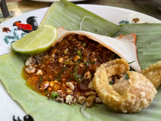 But while mee pun is popular, it’s not my total favorite dish at this noodle shop. That honor would go to guaythiew bear, made of thin rice noodles that are absolutely smothered in a tangy tamarind sauce and blanketed in a square of red pork and fried pork cracklings. Like pad Thai, it’s a bit of a take on Sukhothai noodles, what with the tamarind, fish sauce, peanuts, lime and pork. I’m not sure if the noodles in this dish are made from fermented rice, but yes, once again, they are steamed.