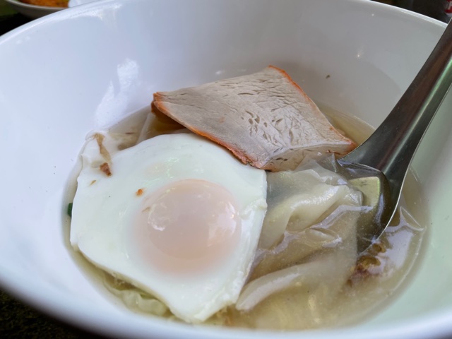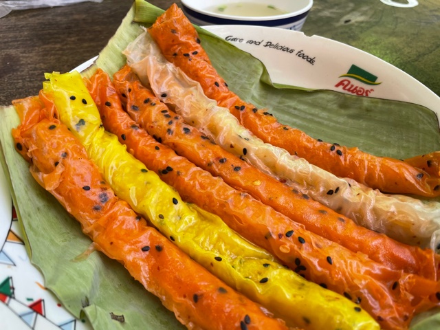 The khao perb is the namesake dish here, but it’s not the dish that’s most at risk of running out if you arrive too late in the afternoon. That honor probably goes to the mee pun, crepes made, once again, out of fermented rice batter flavored with your choice of either pork broth, chilies, or original herb seasonings. My personal favorite is the pork broth. Once again, these items are steamed. Yai Krieng is big on steaming.