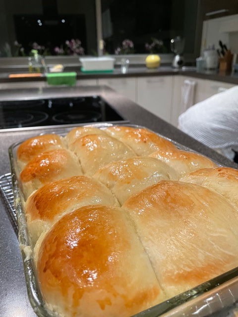 3. Combine 150 ml warm milk and 50 g melted butter and pour over buns right before inserting into oven, preheated to 180 degrees Celsius (150 if your oven runs hot like ours does).