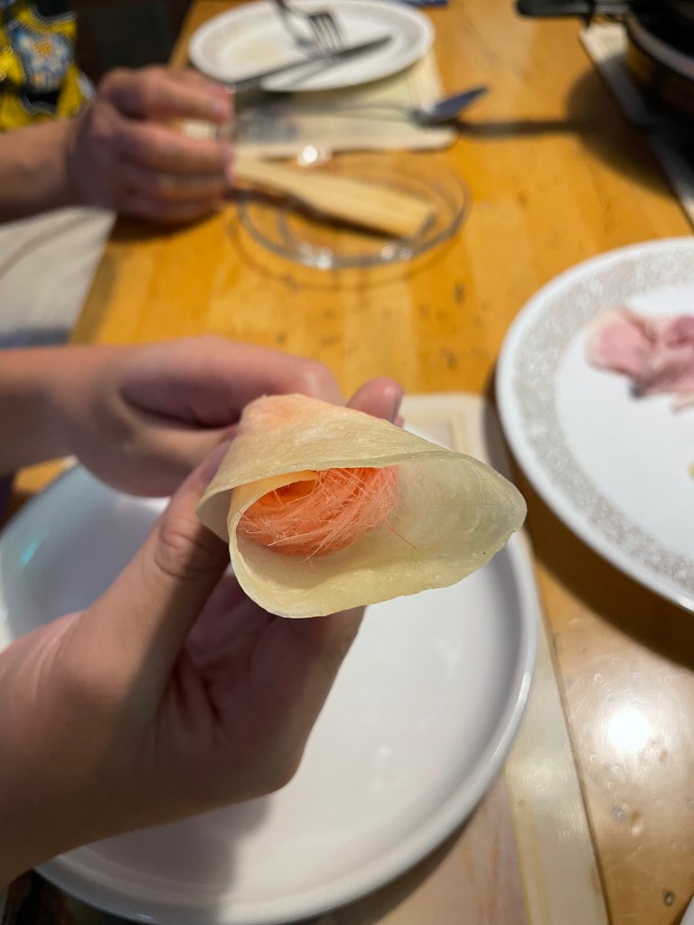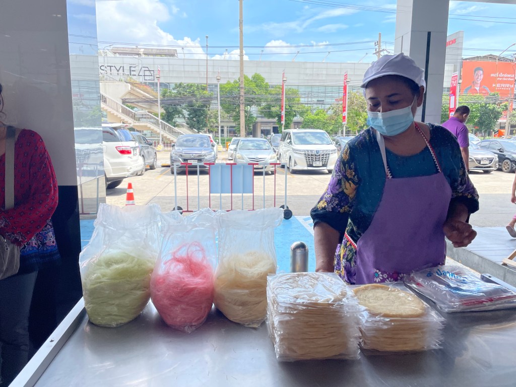 Well, except for eating roti sai mai, of course. This snack, which you can find sold by vendors next to the highway as you head down South, is basically a flatbread wrapped around spun sugar (aka cotton candy aka fairy floss), sometimes colored pink from roselle or purple from butterfly pea flower or green from pandan leaves. But even when the sugar is left to its OG beige, it remains a delight, especially when the roti comes fresh from the griddle like in Khlong Toey market. With the roti warm enough to risk melting the sugar inside, the appeal is undeniable, an unmitigated joy.