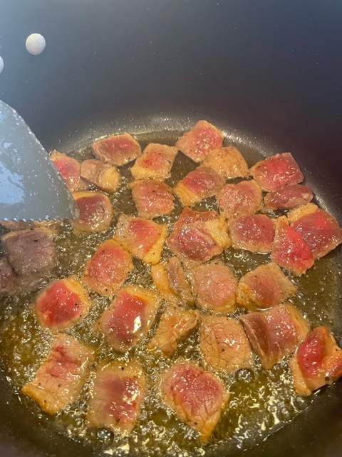 3. Fry until meat curled and edges and is a deep mahogany color.