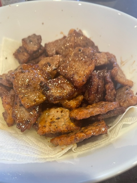 Until then, at least I will have the crackling bonfire of all my previous healthy habits to keep me warm. Here, presenting the first fatal wound to my dreams of sticking to a pescatarian intermittent fasting regime in the States: nuea khem. My father made this to go with sticky rice and nam prik tha dang (garlicky red eye chili dip) for a traditional Northern Thai-style breakfast during my parents’ time Stateside. It’s delicious and unfairly, unwholesomely easy. Perfect for enjoying while mulling over what to do with the ashes of your former princples.