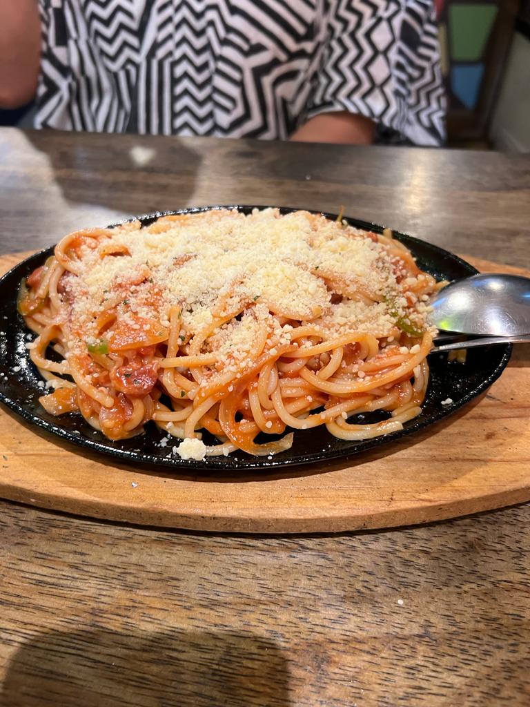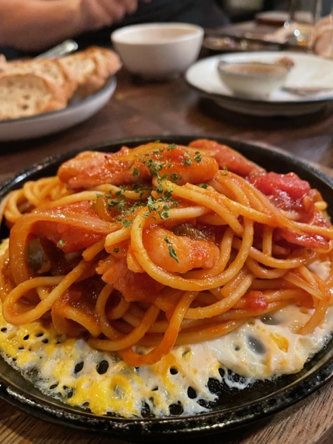 “Spaghetti naporitan” (spelled that way because it’s the usual way to spell it, not because I’m making fun of Japanese people) is, of course, derived from the southern Italian dish spaghetti alla Napoletana, which is basically pasta al pomodoro. It’s not that way in Japan, though. Said to have been created by a chef at the New Grand Hotel in Yokohama and inspired by the food served to American soldiers, this dish uses ingredients common to Japan at the time to create something Western — a real example of culinary ingenuity, like kai kata. The sauce is a melange of ketchup, milk and Worcestershire sauce; the proper “hot dogs” used are smoked Vienna sausages; the pasta is supposed to be overcooked and soggy. Best of all, it’s served on an iron hot plate, over a bed of beaten egg that can be wrapped around the pasta like a blanket as you eat. Seriously, what’s not to like?