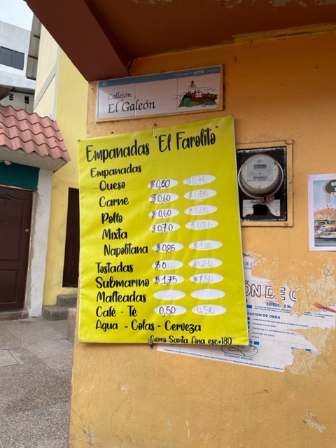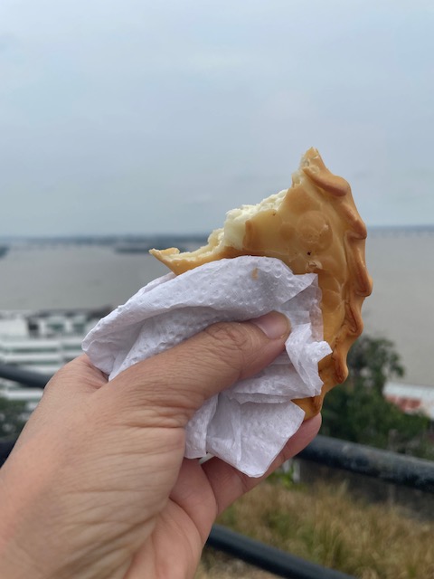 In a bid to make myself as irritating as possible to my husband’s family, I have made it a personal mission to try at least one food item from every stop (except for Easter Island, which has nothing). Although a 3-day rest in Manta afforded a generous number of opportunities for dining on land, the 6-hour pit stop in Guayaquil, Ecuador’s biggest city, necessitated a sort of economy of ambition. I thought up what I could sample on the go as my tour group inevitably lumbered on ahead of me, and my thoughts alighted on one of Ecuador’s most famous street food snacks: empanadas. Originating in Portugal and Spain, these “hand pies” are filled with anything you like, from meat to cheese to a mix of both, a convenient mid-morning or mid-afternoon snack. Portable and presumably ubiquitous, I could simply pick up a few from a chain restaurant or neighborhood store, and that would be that, my local food ambitions quenched.
