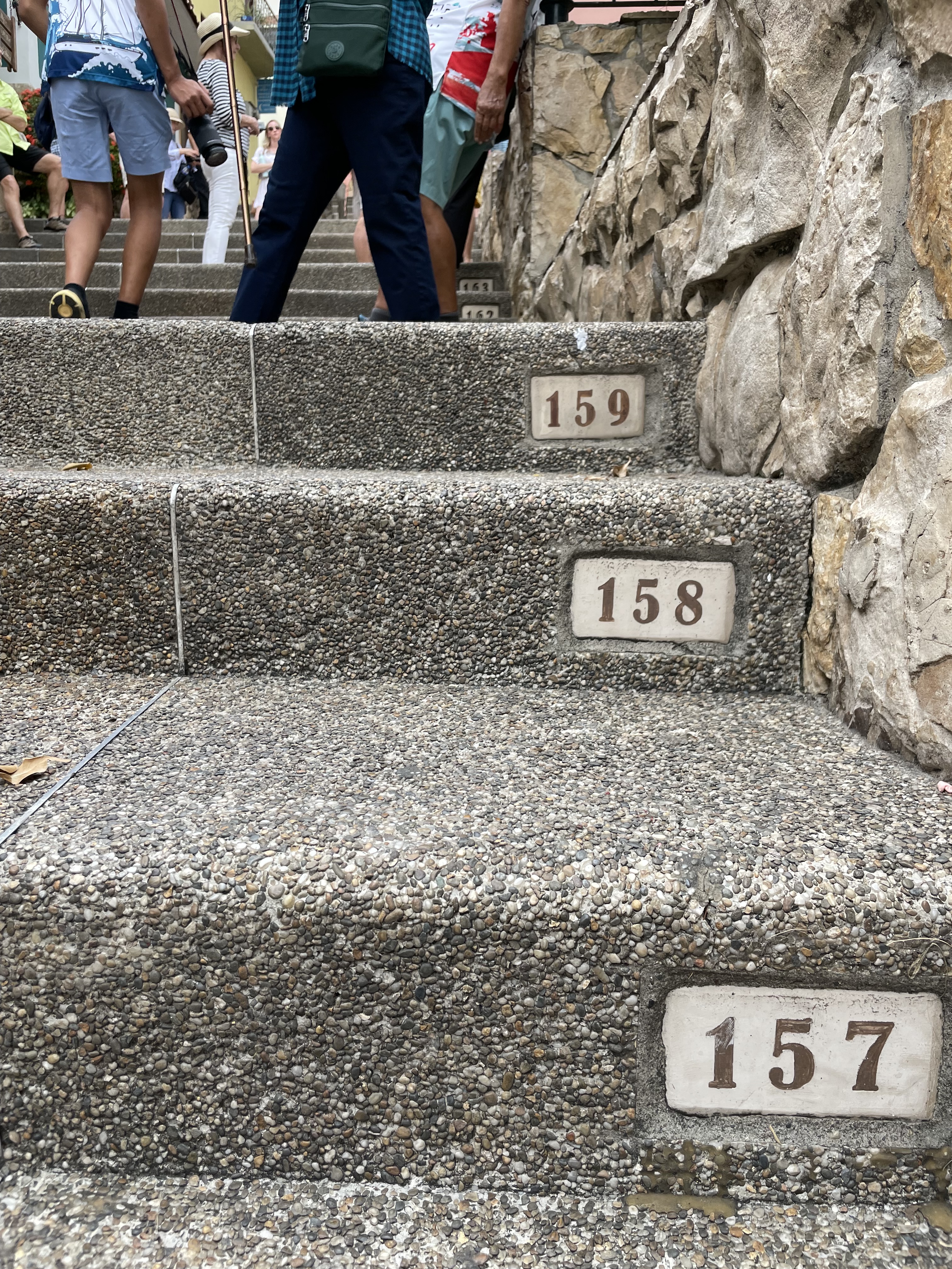 So thanks to my cowardice, I held off, and around the 250th step or so, was promptly rewarded with a bewitchingly delicious scent — something like meat and onions — as well as this sign: