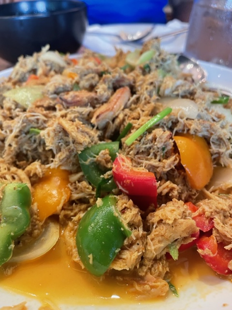 Everything else then started arriving at a brisk clip, expected stuff interspersed with dishes that were less so: stir-fried Chinese kale with large slabs of pork belly; individual bowls of tom yum each sporting their own “baby lobsters” like a sunburned man in a jacuzzi; a gang kua of well-stewed beef shank; enormous platters of crabmeat doused in a yellow curry sauce.