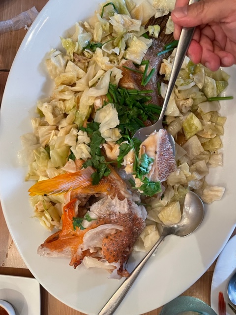 And just when everyone was ready to stick a fork in themselves (because they were done), a laughably enormous steamed grouper was ushered to the table, cooked in a soy sauce dressing and nestled in a bed of melt-in-the-mouth steamed cabbage, ludicrously delicious.