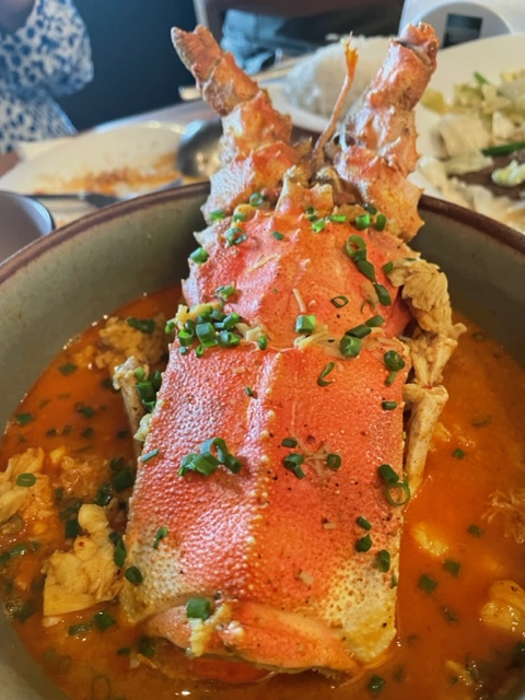 Another large bowl, enough to feed a family of 6 in Thailand, brought us a lobster “khao soi” crowned with an improbably big lobster head, its meat shredded in a khao soi broth and accompanied by pickled mustard greens and fresh lime wedges in a nod to the dish’s origins.