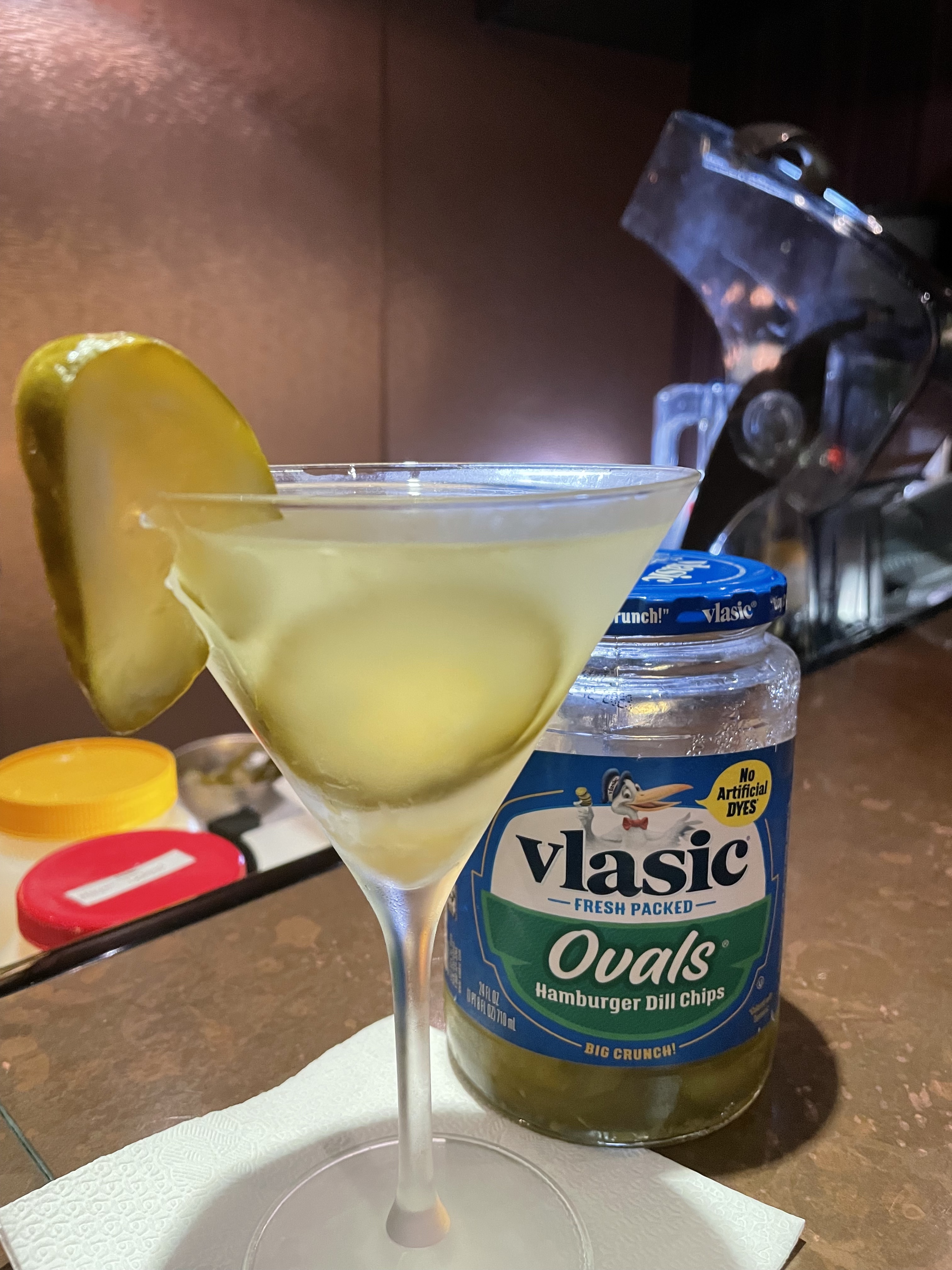 On my next sea day (in three days’ time), I will be ordering this drink created by one of the ship’s bartenders, William Villianueva, who made me this martini after I told him that 1. I don’t like martinis, and 2. I love dill pickles. He very graciously gave me the recipe, so here it is. It is surprisingly good. I enjoy drinking it while playing Clue in the bar like a big old nerd. It’s one of the things I’ll miss when I’m back home.