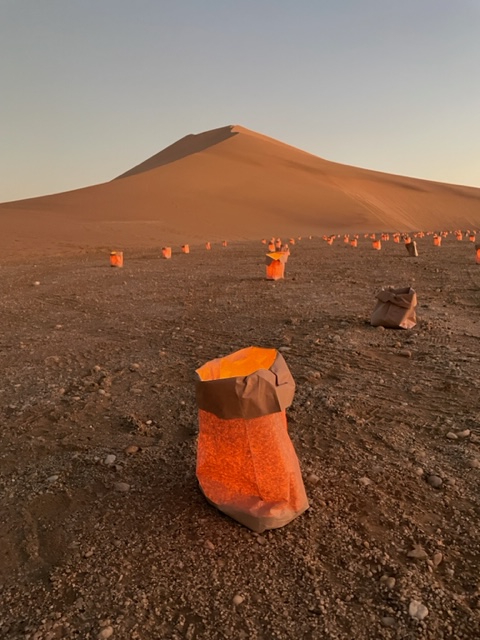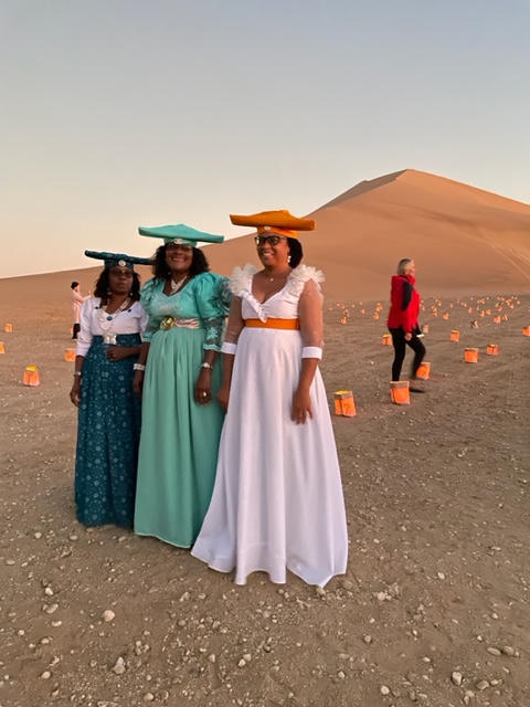 The last event, though, was set among the sand dunes in Namibia, and it was spectacular, even if I had to shamelessly loiter around the buffet so that I could be there when it opened. Outside, narrow ditches hosted lit fires for warmth as fire dancers performed with burning ropes and sticks in front of tables set with flutes of champagne and cheese and crackers. Herero tribeswomen in beautiful outfits mingled among the guests as the sun set. When the wind shifted and the smoke got too thick, we had dinner in the tent at tables set with bottles of wine and handmade pots of local lip balm, in case the desert cold seeped into the gathering. By the time we had left, the sky was pitch black and the stars clear to the naked eye. The ride back was a lot shorter than the ride there.