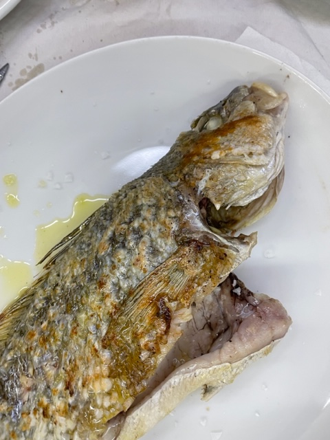 By this time, we are almost full, but Jordi’s special pick, the cordova, is on its way. It comes hot from the oven, skin blistered with the scales still on and in a puddle of fresh olive oil. We summon up what’s left of our appetites and attack, stripping the skin to reveal glistening juicy flesh without need of anything else (although, being Thai, I wouldn’t turn a seafood dipping sauce down). By the time we are done, only the carcass is left and even the head has been dismantled. The cost of the seafood: 160 euros; the cost of the restaurant meal: 70 euros, including beers for all 6 people.
