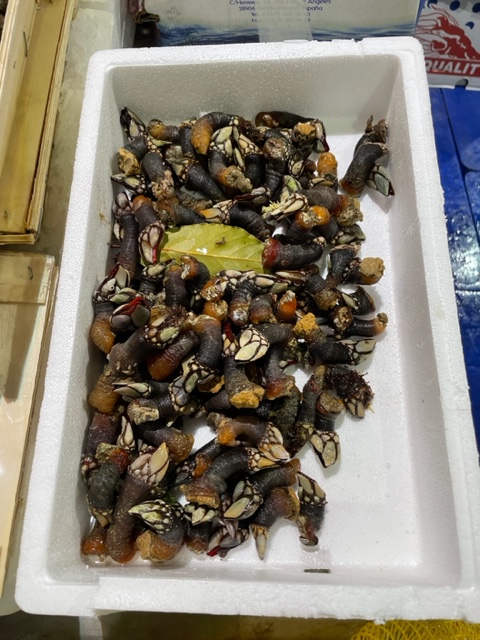 Jordi seems less than enthused, but picks one up for me to suck at. “Do you know how to eat these?” he asks, and to be honest, I think I’ve had them before, but I don’t remember. Right there on the market floor, he breaks off the “horned” part of the limpet before handing it to me, instructing me to suck the coral-colored stuff inside the rubbery “stem”. As for the scaly cloven side, he tells me to break it apart with my hands, picking at the pink meat with my fingers. It is all very sweet and indescribably fresh. There is juice on my face and hands. I look around for a trash can. There isn’t one. Jordi tells me to just drop the remnants onto the floor.