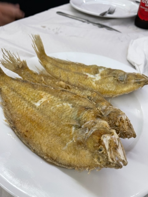 By this time, we are almost full, but Jordi’s special pick, the cordova, is on its way. It comes hot from the oven, skin blistered with the scales still on and in a puddle of fresh olive oil. We summon up what’s left of our appetites and attack, stripping the skin to reveal glistening juicy flesh without need of anything else (although, being Thai, I wouldn’t turn a seafood dipping sauce down). By the time we are done, only the carcass is left and even the head has been dismantled. The cost of the seafood: 160 euros; the cost of the restaurant meal: 70 euros, including beers for all 6 people.