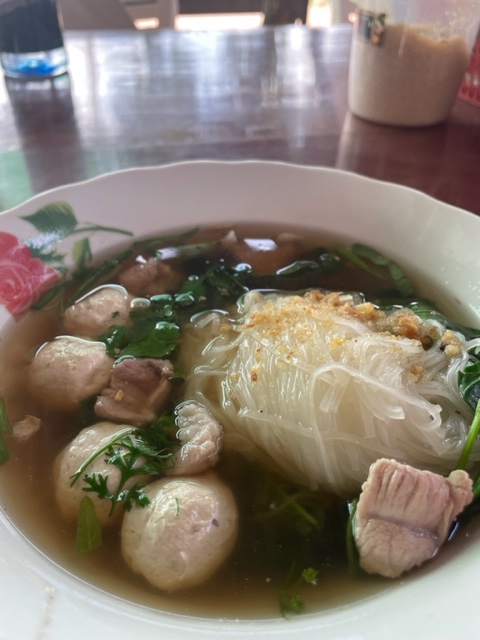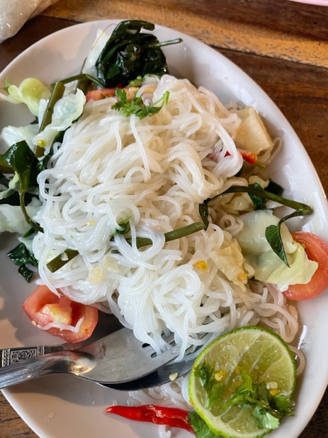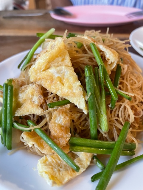 Obviously, I made such a fool of myself screeching as I teetered over the water that a Laotian woman took pity on me and ushered me to the other side. When we got there, we paid a border crossing officer 90 baht each and were left to our own devices. We were in the middle of a sleepy village where a few people were grilling meat over charcoal as a few others halfheartedly attempted to sell things. A temple, decorated with hand-drawn murals depicting village life (including soldiers and government officials) was the main draw here. Luckily our breakfast awaited just steps away: what Aarya called “pho” and what we just call “guay thiew”: a heaping bowlful of it, leavened with freshly picked morning glory and plenty of Lao Beer to fortify us for the walk back.