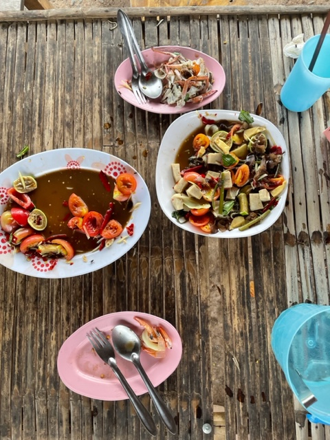 So we of course ordered som tum, a local pad mee (fried noodles) and kanom jeen sot (fresh fermented rice noodles with a dipping sauce) as the sky opened into a downpour and an enormous spider the size of my hand scuttled down the wall behind Aarya.