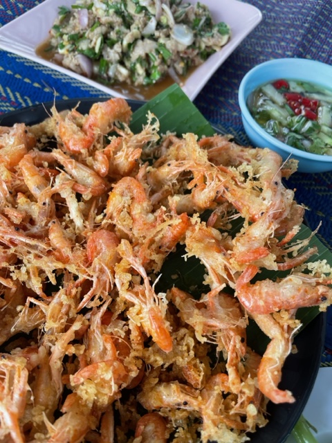 We had better luck later on along the Mekong, a mighty stretch of ochre-colored water across which Laos was clearly visible. At a collection of seafood restaurants specializing in pla nam khong (the local fish) and freshwater shrimp, we stopped at a restaurant advertising its “dancing shrimp” (a spicy salad of live baby shrimp — sorry — with lots of chilies and garlic) and enjoyed a leisurely afternoon by the water with our lunch, happily not balancing over it on a flimsy raft made of lashed-together bamboo.