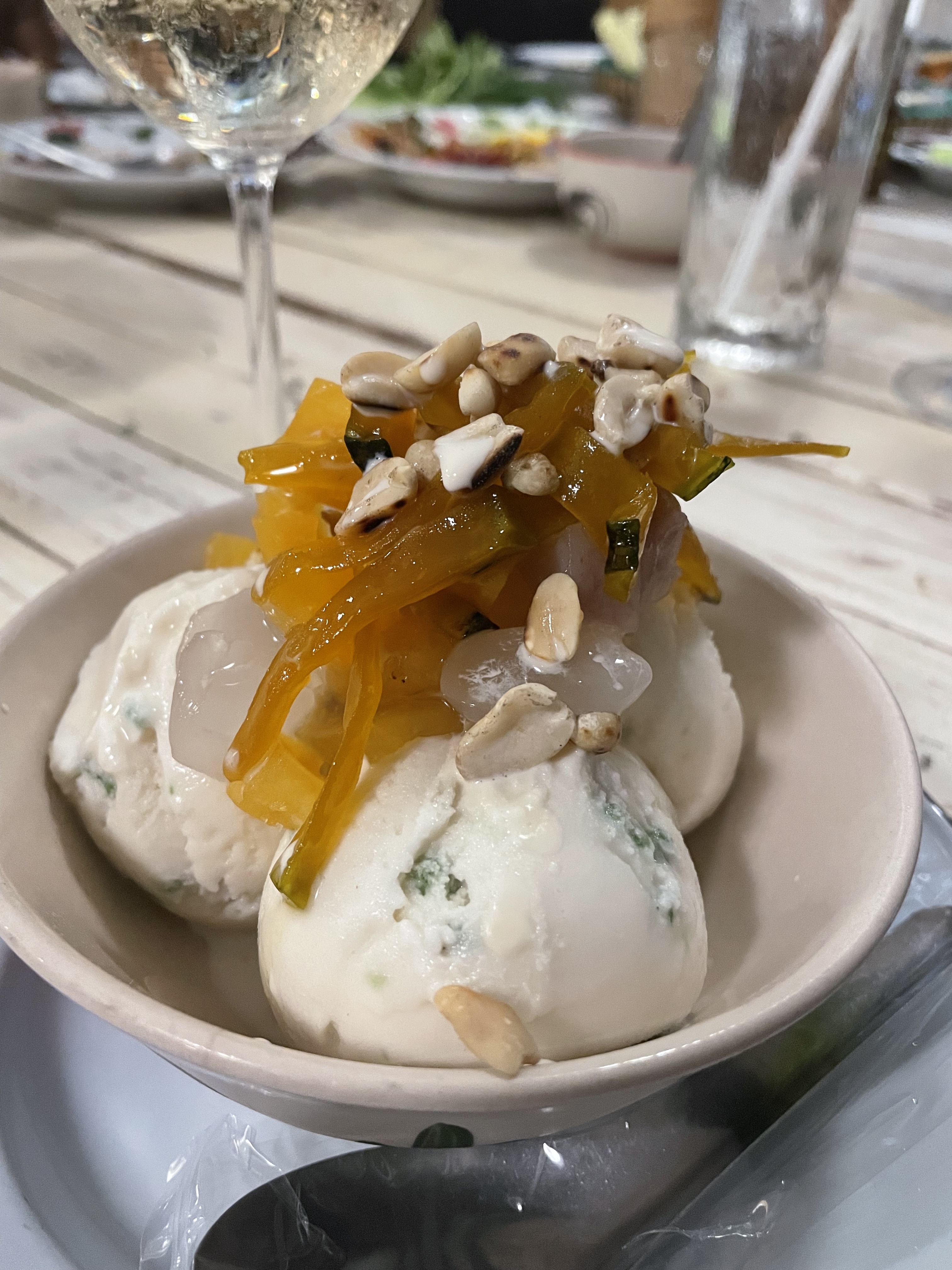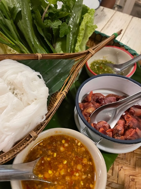 Even more of a revelation were the recommended “Udon Thani” dishes they ordered to accompany the stew, like a frankly delicious chili dip pounded from local water olives and the signature heart cockle miang to be eaten like a grilled fish “miang” would be: stuffed into a leaf with fermented rice noodles like a taco and doused in one or both chili sauces.