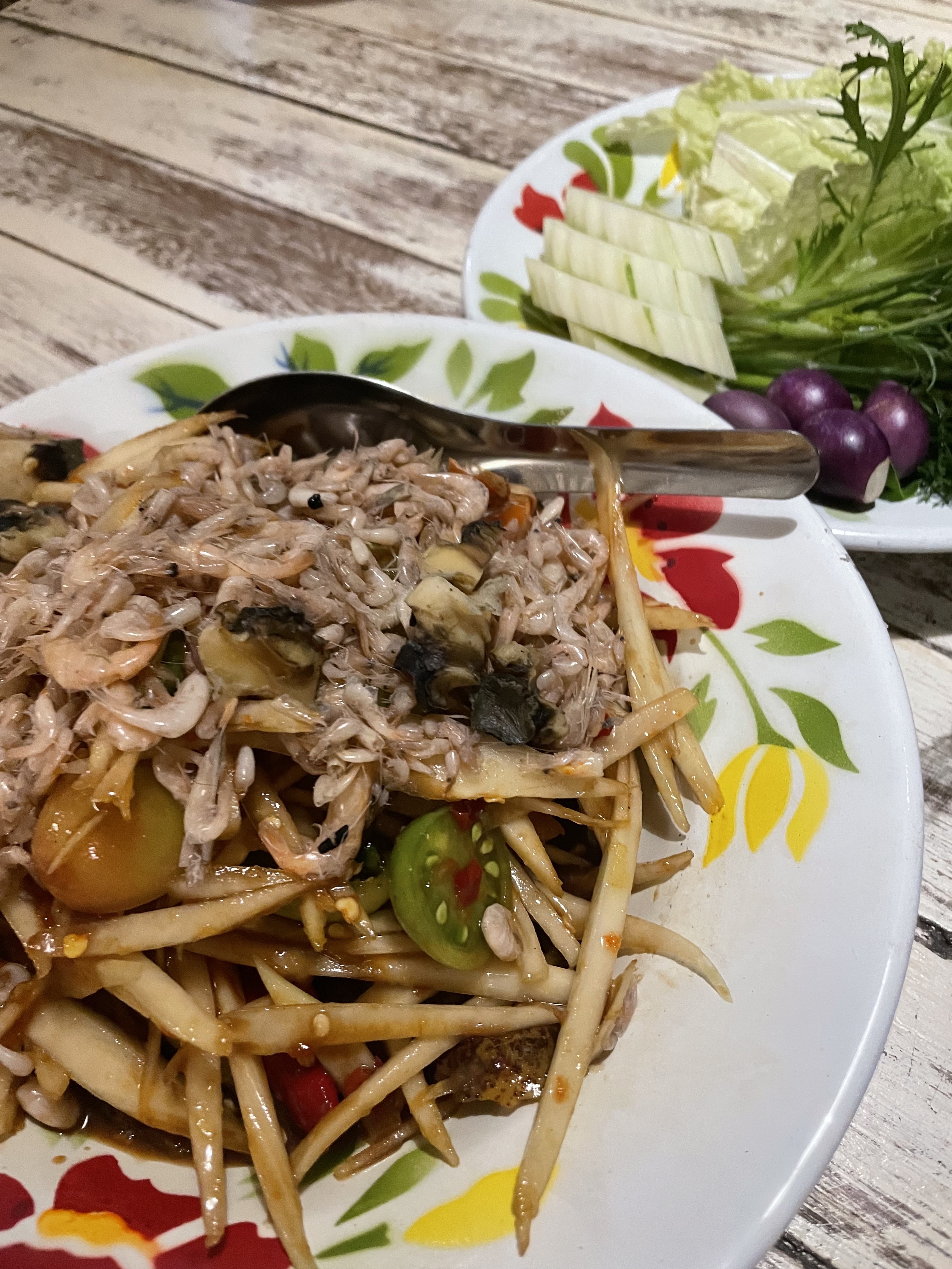 We struggled between choosing a som tum of cut fermented rice noodles or a presumably “Udon Thani”-style one slathered in tiny freshwater shrimp from the river, and ultimately chose the latter.