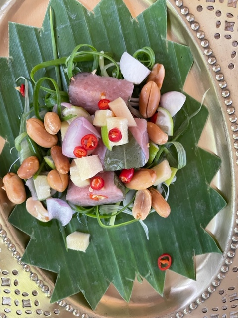 But it’s not all sweat and caterpillars. There’s an upside to this kind of work, especially when it comes to matters of the table. I (again, a 50-year-old woman) got to sample my very first moo kata (Thai-style pork BBQ) at my friend Aarya’s house in Loei, supervised by her incredibly generous and warm-hearted mother. I sampled various types of “Isaan eau de vie” (a creative euphemism for lao khao, or moonshine) at Kaen, and got to witness Chef Num’s creative reimagining of Isaan cuisine at Samuay & Sons. And I was able to enjoy a vast multi-course lunch at Krua Supanniga by Khunyai Somsie — for free, because we ended up being owner Khun Eh’s guest without realizing it!
