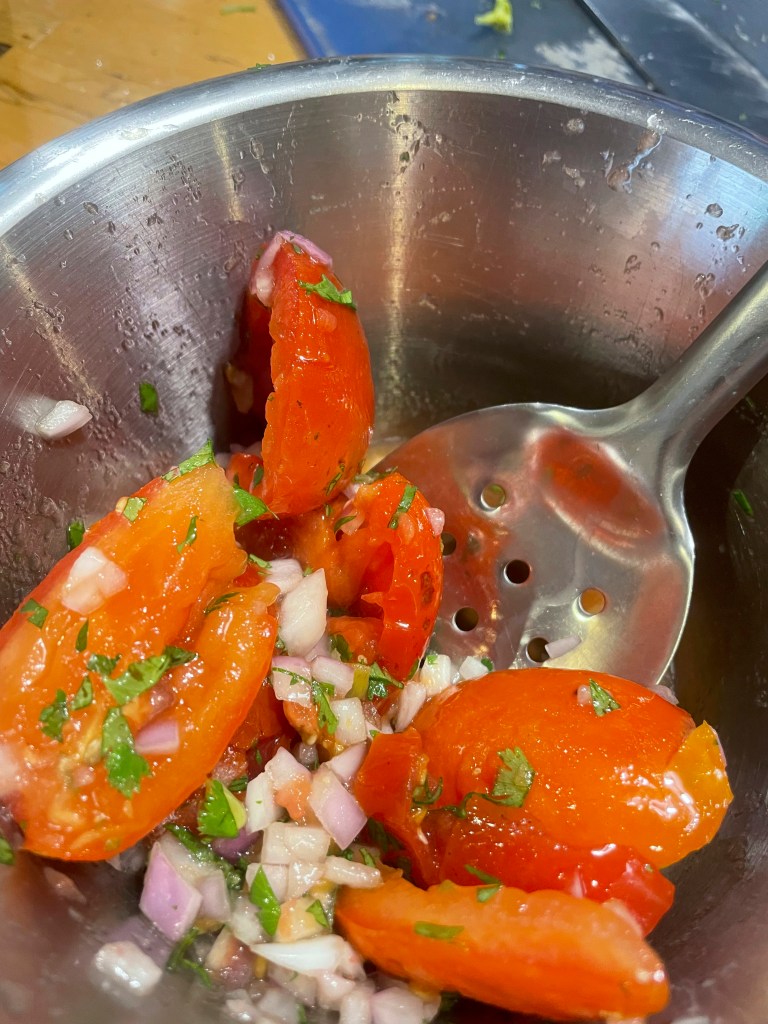-3 ripe tomatoes, skin on or off, cut into quarters or in halves depending on size