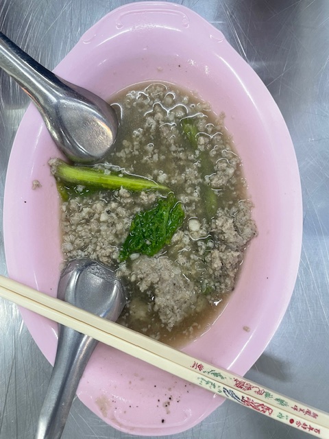 The left hand shop has expanded to across the street, soon after it was awarded a Michelin Bib Gourmand. For that reason, it is considered the “superior” noodle shop, though both are packed at lunchtime. All of the hallmarks of the Michelin Bib Gourmand stop are there: diners lugging suitcases on their way to/from the airport, tense queues full of gimlet-eyed customers, harried waitstaff. To make things easier, there are the dreaded laminated menus (something I used to dread, but which are now at all the street food shops I used to champion). They make ordering easier, it’s true. My husband and I both ordered the tom yum noodles ruammitr (with everything) in broth, and the pork meatballs in broth on the side.