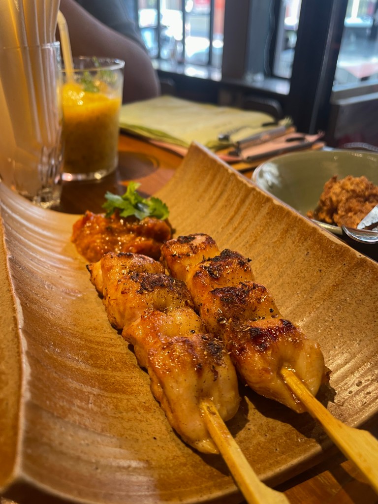 The menu is full of great little surprises like old-fashioned kanom jeen sao nam (fermented rice noodles with coconut milk, pineapple and shrimp) and Southern Thai khao yum (rice salad), but what struck me most were the dishes clearly inspired by Japanese cuisine, like the “chirashi” of Thai seafood scattered over rice, or grilled chicken thigh on bamboo skewers, served with sticky rice and a healthy dollop of jaew bong (Isan chili dip).