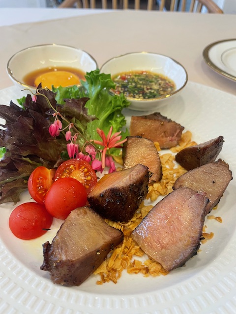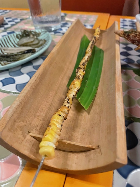 But wait, I’m getting away from the Japanese thing. Perhaps the OG of seriously pairing Thai with Japanese food is Chef Black of Blackitch Artisan Kitchen, who became interested in cooking while studying in Japan to become an engineer (this also helps explain Chef Black’s preoccupation with all things fermented). When we were able to grab a table during COVID, Chef Black actually sent out an entire tasting menu of Japanese dishes (he said he missed traveling to Japan). This time, Chef Black came out with a series of dishes that included really good handmade soba, two types of sausage with grilled vegetables on skewers (what would modern Thais do without yakitori?), and beautifully treated shellfish with blanched mustard greens, a slice of tamagoyaki, a Japanese-style croquette, and the daintiest of pickled vegetables.