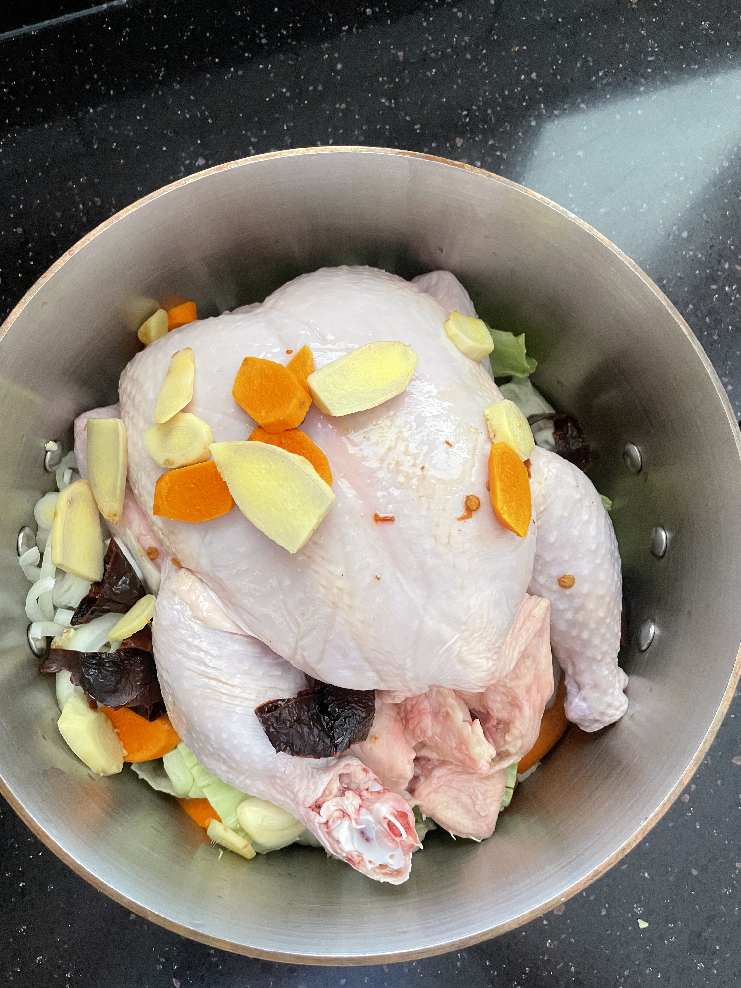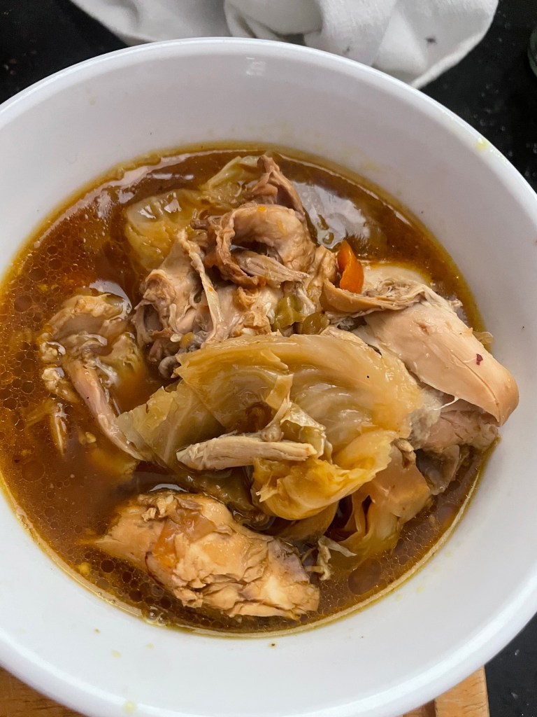 So here’s an Asian recipe that I think satisfies just about every possible obstacle for people with executive function issues, or for people who just want something easy to deal with (although you do have to chop some cabbage, onion and a carrot). And I found out about it from Twitter! It’s the “no-water” chicken soup, which is cooked over very low heat in little to no water so that the vegetables and chicken can exude their own juices. I used regular cabbage, omitted the goji berries and added turmeric, as well as a roasted Sichuan-pepper-and-salt mix left over from another failed Sichuan eggplant stir-fry (Karen said it was too salty).