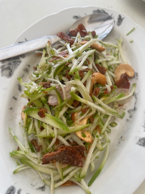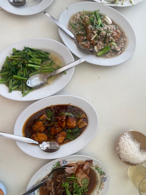 According to the Songkhla guide, there are five dishes that regulars always order here. The first is a delicious yum of “mamuang bao”, an egg-sized green mango native to Southern Thailand that is studded with little umami bombs like strips of dried squid and dried shrimp powder (on the side for us, because my husband is allergic). There’s a “dry tom yum” of deep-fried seabass with tons of lime leaves, lemongrass, galangal and roasted chili paste. A dry “pullo” (Chinese-style five-spice stew) of duck snuggled against red barbecued pork. Tofu “song krueng” (“fully dressed”), slathered in a cornstarch-thickened minced pork sauce larded with scallions and ginger. And either deep-fried whole fish or our choice, stir-fried morning glory, not smothered in chilies but simply cooked with garlic and a fermented brown bean sauce, simple and secure in its flavors, a genuine taste of mid-20th century Thai-Chinese cooking.