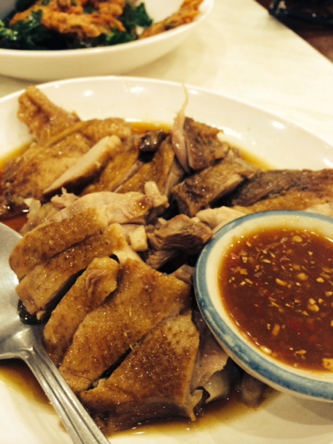 A good meal will make your forget these things momentarily. So will a good drink, but it’s noon, and things are not (yet) as dire as all that. So when Chris takes me to the far end of Nana (past the entertainment complex, past the various Indian restaurants, and what appears to be a fairly new gigantic Subway), we end up in the kind of relatively quiet, sedate neighborhood that you’d expect to find much further from the pulsing heart of the city’s nightlife center. Right before the street dead ends into a factory sits the Thai-Chinese restaurant Ros Niyom (172-174 Sukhumvit 4 Nana Tai, 02-255-0991), an aharn tham sung (made-to-order) spot that specializes in pet palo, or duck braised in 5-spice sauce. You can tell this is what to order from the ducks hung from their necks in front, where a fairly taciturn lady silently dissects duck meat and skin for practically every table in the restaurant. And it’s not just the duck meat that’s in demand here: also a specialty, the congealed blocks of duck’s blood served swimming in a duck broth, its jelly-like texture contrasting with the sour chili sauce ladled over the top.