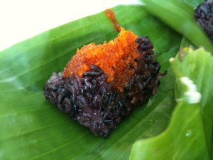 When I get to Pa Choung (4/3 Amnuaysin Rd., 082-212-4490, open 6-noon), she is in the middle of making merit. On the hob: a fiery gaeng som full of little shrimp and dok kae (what I’ve seen referred to on some menus as cowslip blossoms), pad ped moo pa (stir-fried curried wild boar), dried and butterflied fish, sun-dried beef, deep-fried pork cutlets and a green curry full of slivered bamboo shoots.