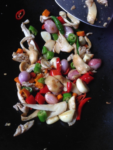 In 1 tsp oil, fry garlic, shallots and sliced chilies in hot wok with mushroom pieces until “dry”, about 5 minutes.