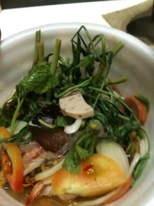 Yet these hua pla restaurants resolutely cling to life on the Bangkok dining scene, scattered here and there in the unfashionable sections of town. A subset of the Chinese-Thai restaurant, hua pla places also feature stir-fried seafood dishes, fried rice and noodles besides the namesake dish, a fresh fish (usually giant pomfret, or thao theuy) in either pickled plum or taro broth (pickled plum is better), bubbling contentedly in a metal pot set over a small flame.