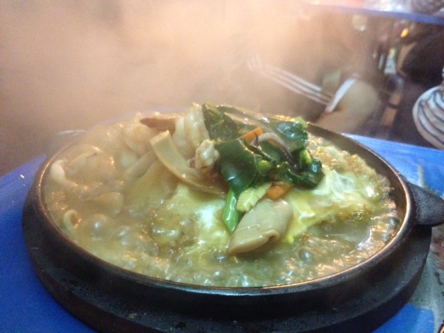 The reason for all the excitement — despite the wait elicited by having to wash all those hot plates for new customers — is obvious. Take, for example, the guaythiew lard na talay (seafood gravy noodles), charred to a crisp on the bottom, just like the bottom layer of rice in a good paella. It arrives at the table still seething, emitting a slight hiss, but when the server upends a pitcher of gravy over the liquid, a giant plume of smoke and sound erupts: