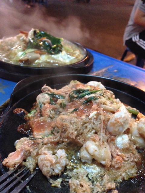Enter Krua Porn Lamai (081-823-0397). Despite the suspicious likeness of its name to a made-up massage parlor in a future installment of “The Hangover Part 34”, this outdoor vendor specializes in kata ron, or “hot pan” — fried noodle dishes given the special oomph afforded by the sizzle and smoke of a heated plate. Part of a “cooperative” of vendors that share tables and help service each other’s customers (something I’m seeing more and more of nowadays), Porn Lamai is set right at the entrance to Soi Plang Nam, just as you turn right from Yaowaraj Road. All those tables with hot plates on them? That queue of excited-looking customers staring at other people’s food? That’s them.